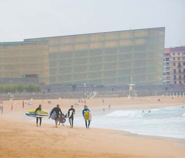 La playa de la Zurriola se halla en el barrio donostiarra de Gros, bajo la atenta mirada del Palacio de Congresos y Auditorio Kursaal.